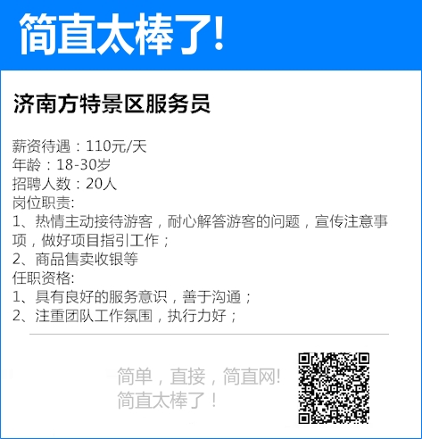 假期服务员包吃住 薪资待遇:100元/天 年龄:18-39岁 招聘人数:6人 工作地点:济南泉城路世贸广场 1、岗位职责:帮助客人引路,座椅拜访,打扫区内卫生等 2、提供员工宿舍,空调...
