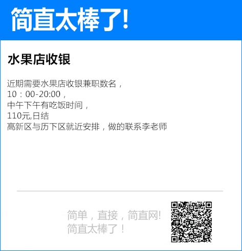 寒假工果蔬店店员 85元/天 2人 时间:早班:7:30-16:30;晚班:12:00-21:30 地址:历下区名士豪庭 2人 槐荫区凯旋新城 1人 要求:连做到腊月27 ...